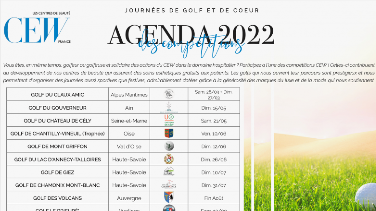 CEWLes beaux jours reviennent : les compétitions de golf au profit des Centres de Beauté CEW recommencent ! L’équivalent de 2 000 à 2 500 soins sont effectués chaque année grâce à ces journées de golf et de coeur.